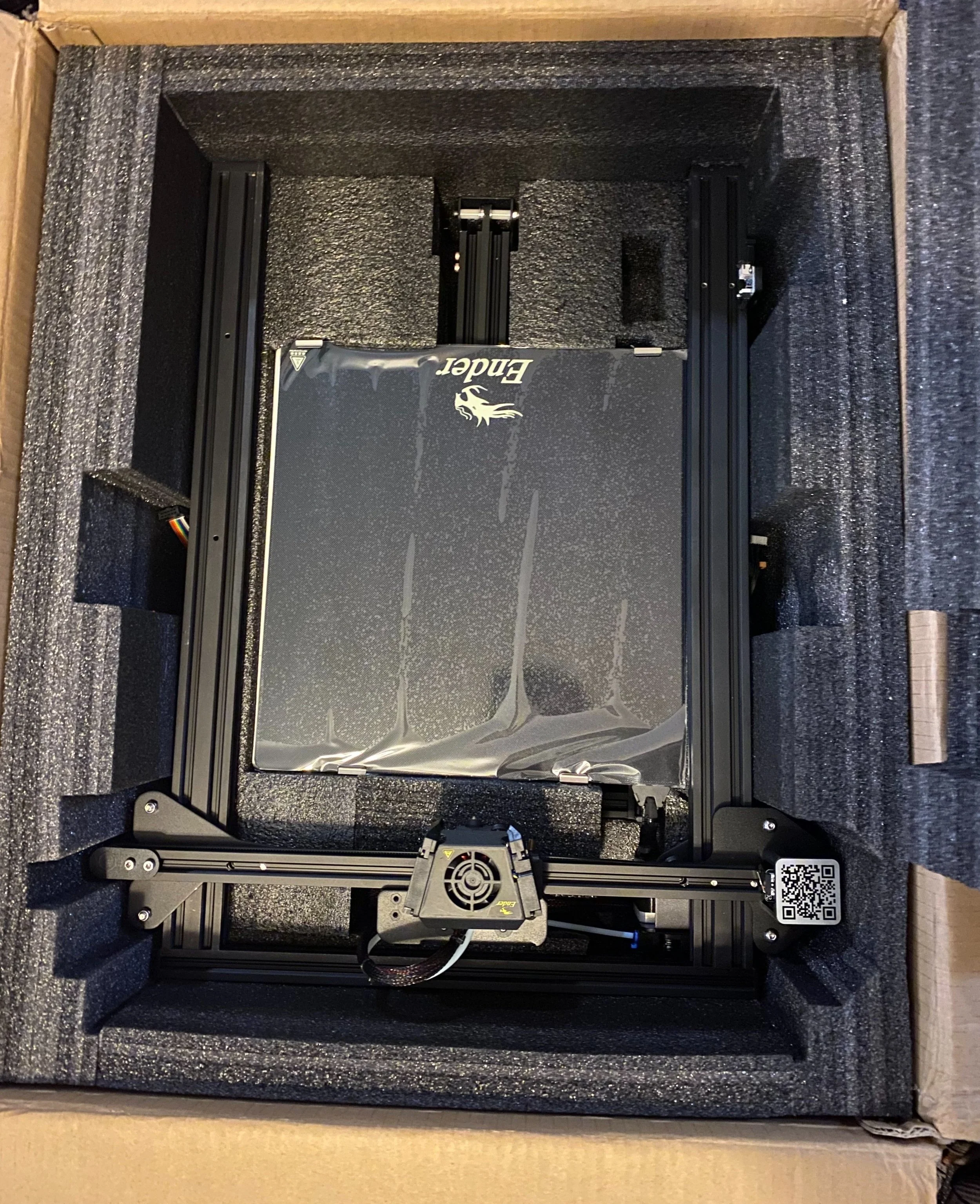 The Ender 3 Max is securely packaged in foam box inserts. Remove the pieces from the top insert, then remove the insert itself to reveal the main pieces of the 3D printer. Remove the gantry frame assembly from the box, but use caution since it is connected to the printer base assembly. Once removed, you’ll be able to remove the printer base assembly from the box.