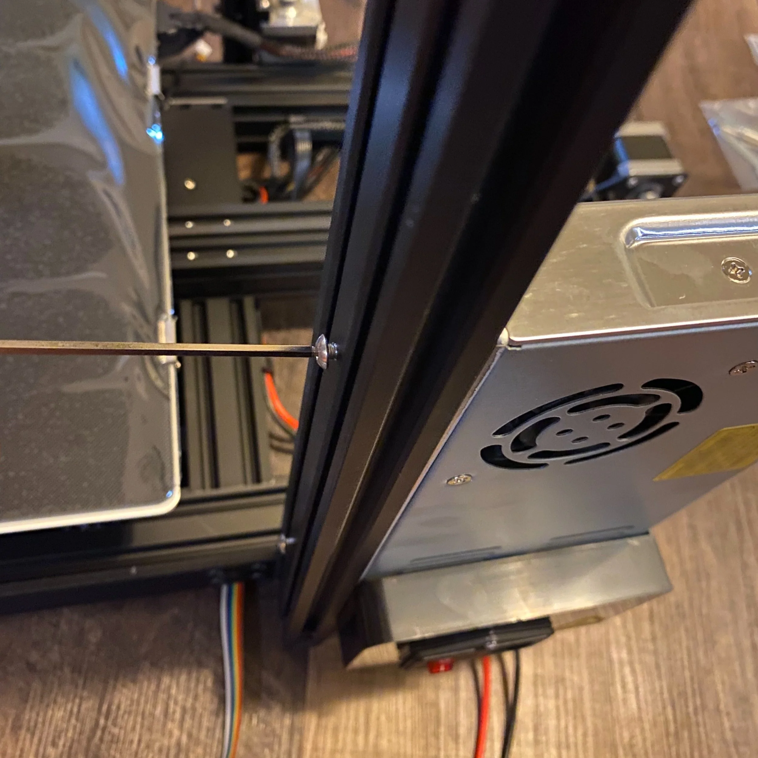 The power supply is mounted to the right side of the gantry frame. You’ll see two holes on the frame where you use two 25mm screws (the larger ones) to mount the power supply.