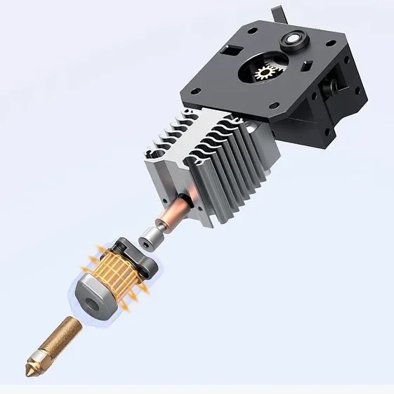 A redesigned hot end with a larger heat cartridge and a longer heated area, which enables higher flow rate printing, which is important when trying to print very fast
