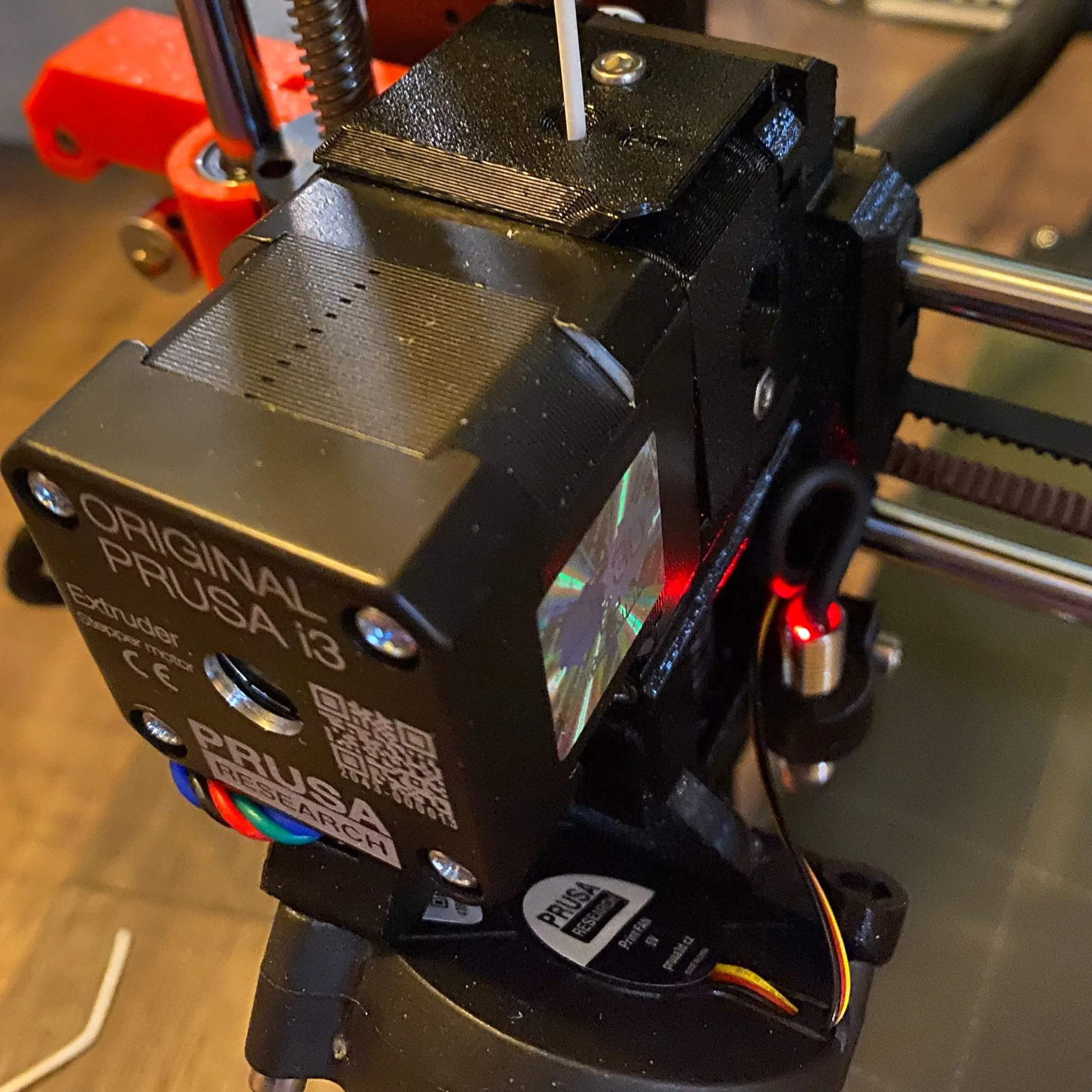 The Prusa MK3S+ uses an inductive probe for auto-bed leveling, mounted to the side of the assembly (see the red LED).