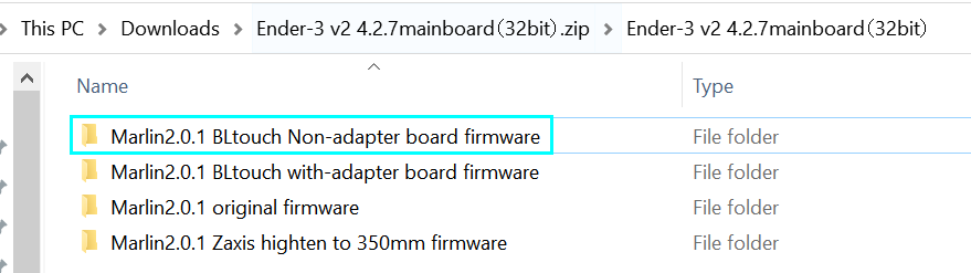 Open the folder for the “Non-Adapter” firmware, since we are using the dedicated port. For Ender 3 Max, instaead use Ender-3 max 4.2.2mainboard bltouchfirmware.zip